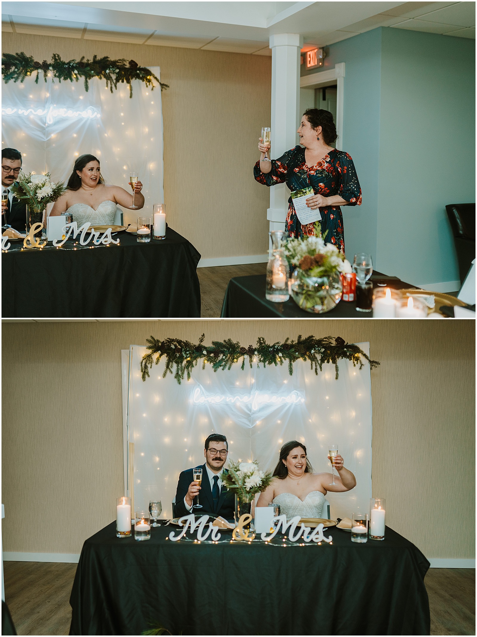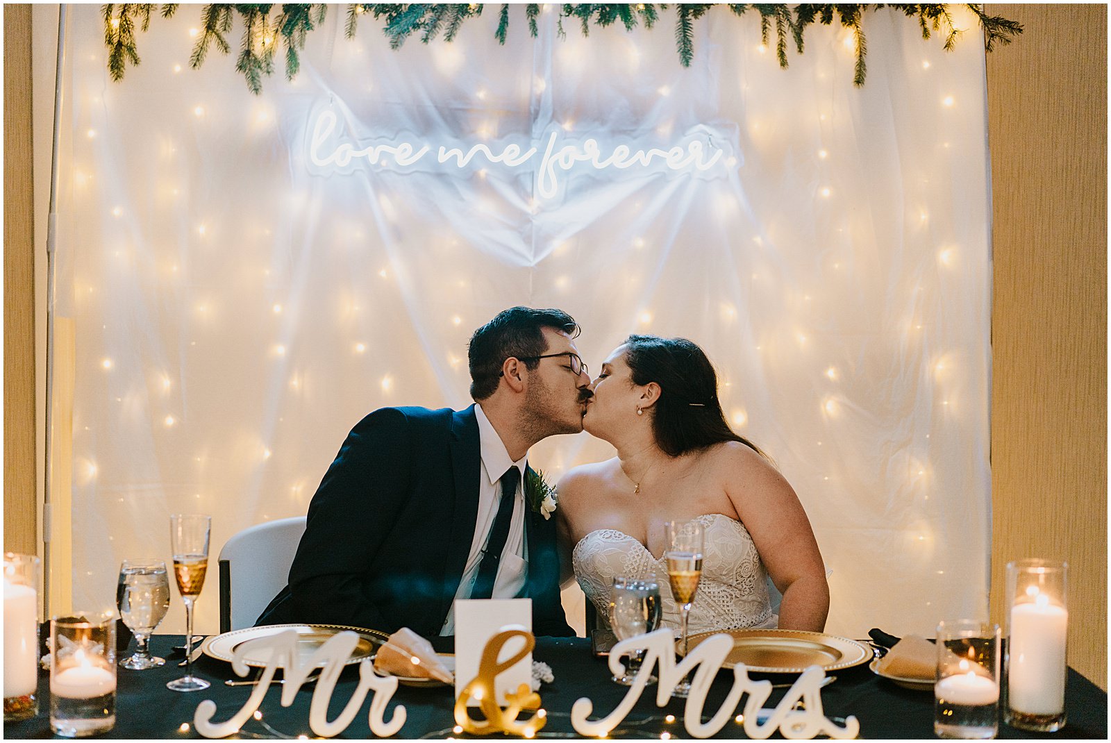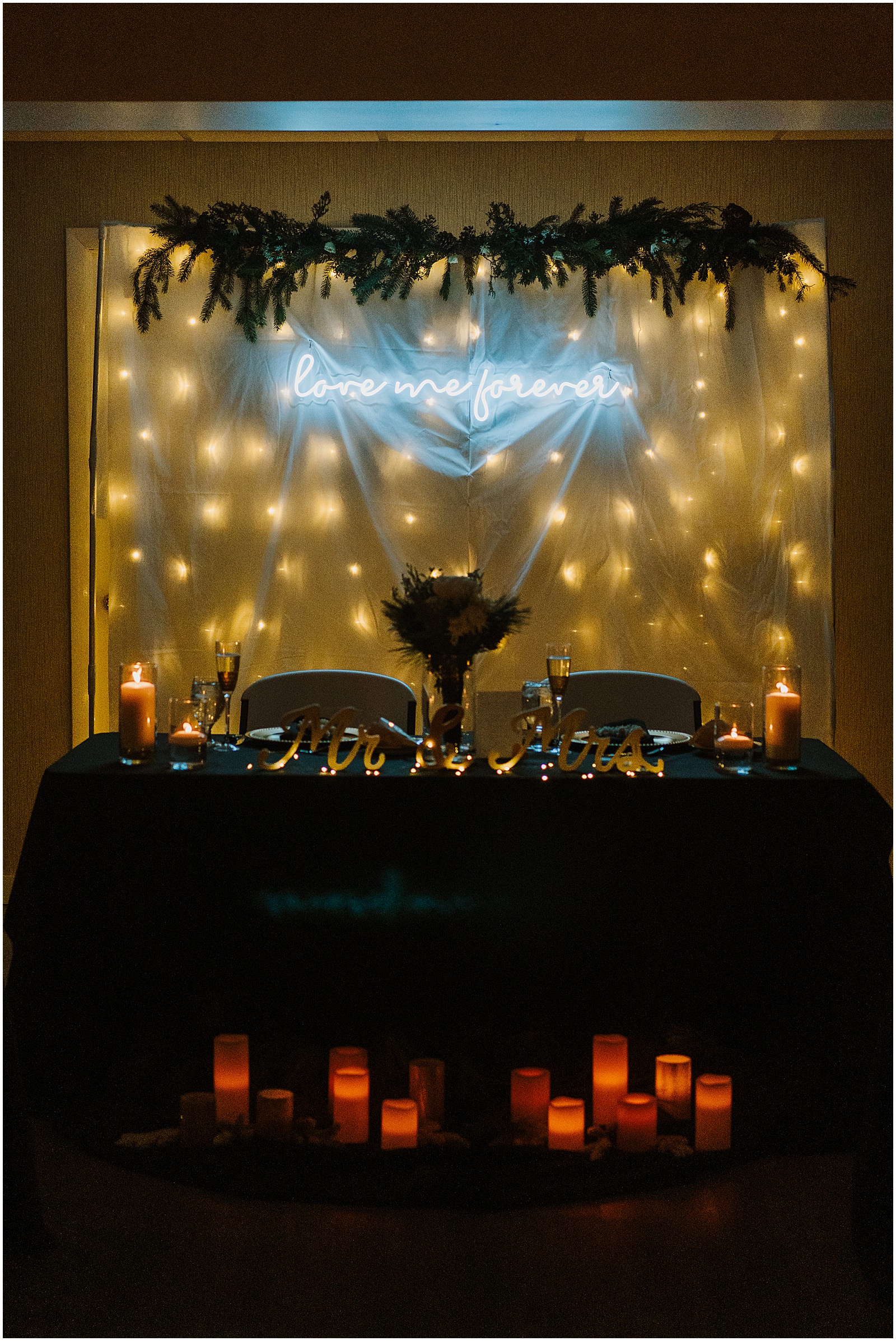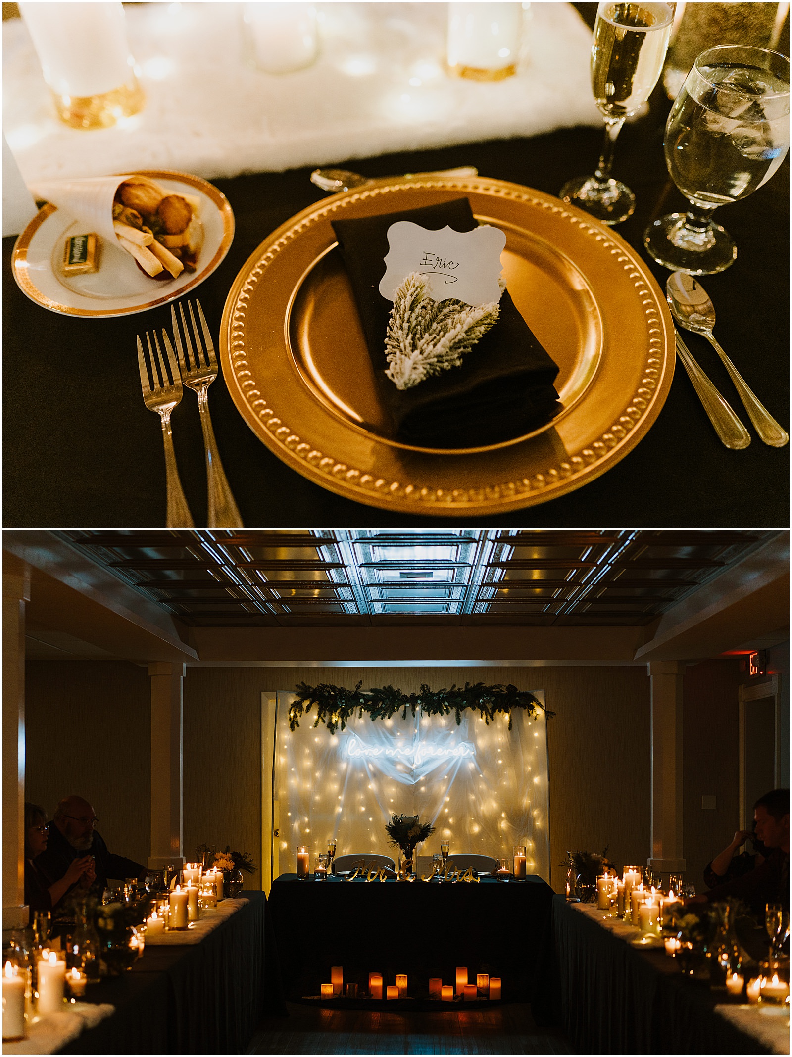 Their intimate winter wedding came together with the help of their families and I think it turned out absolutely beautifully. They were married in Kaitlynn’s dad and stepmom’s church, St. John’s Lutheran in Fowlerville, Michigan. The family helped decorate their reception space, with the absolute best element – a neon light right behind their sweetheart table. That light is now in their bedroom at home!