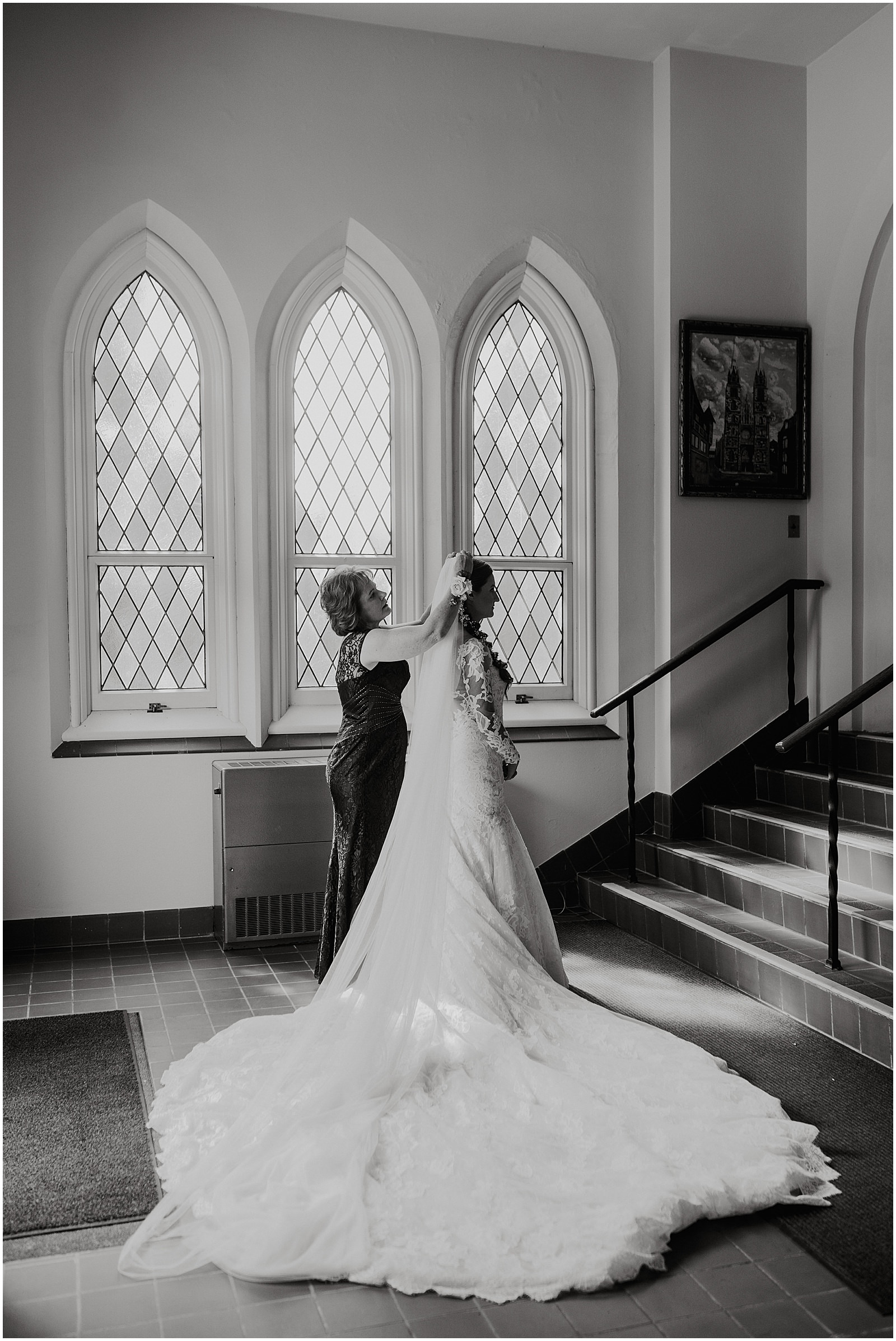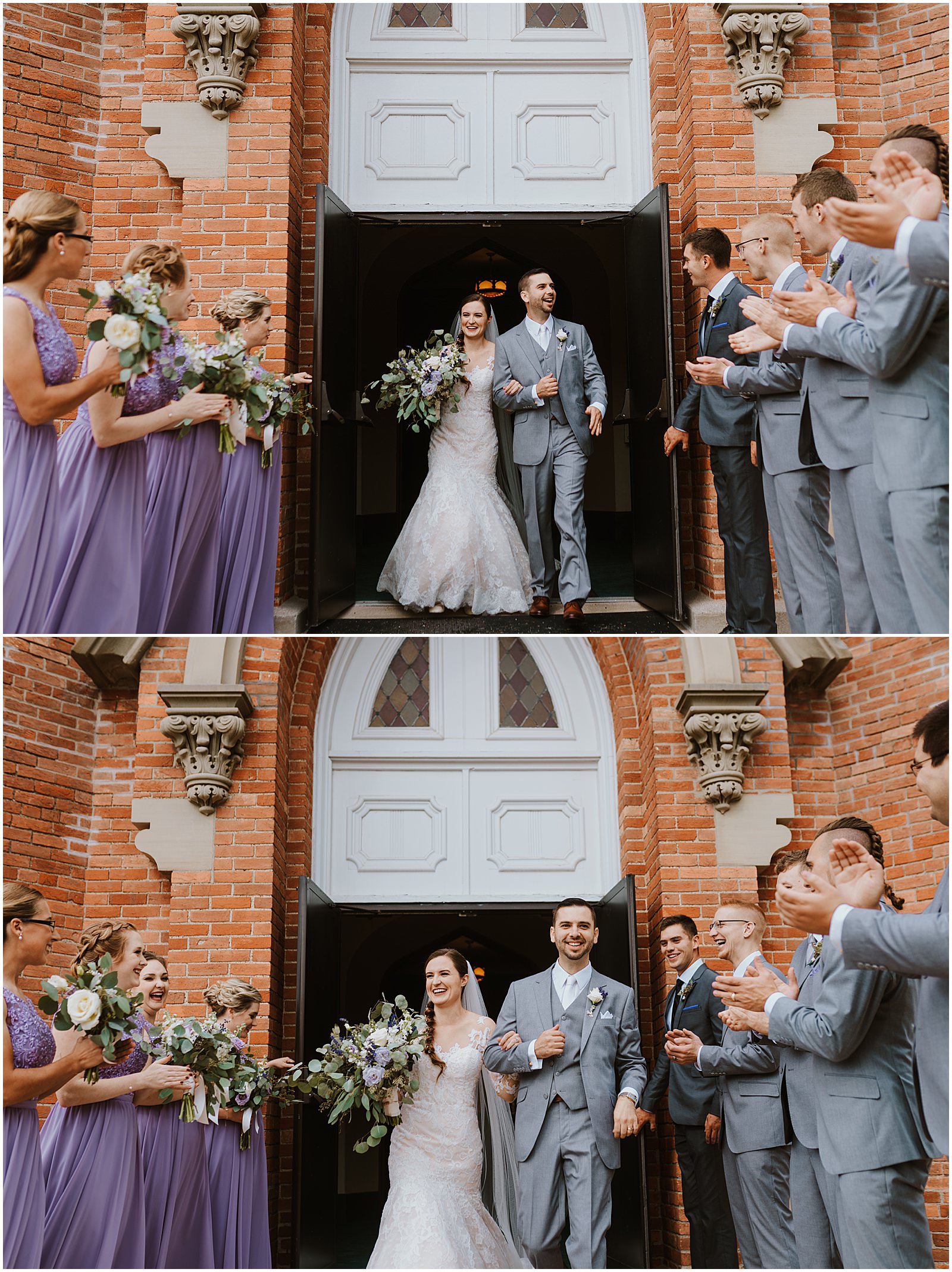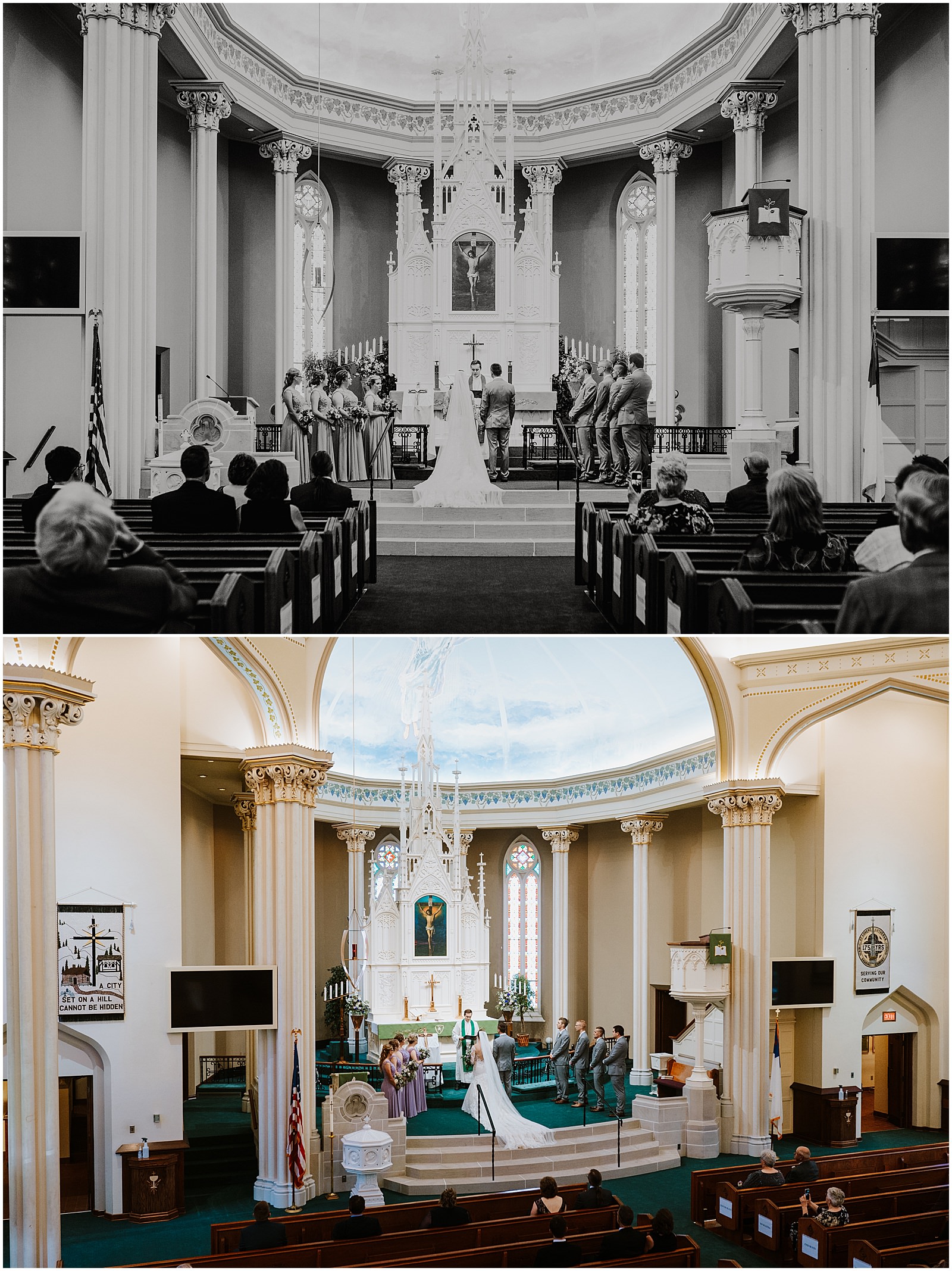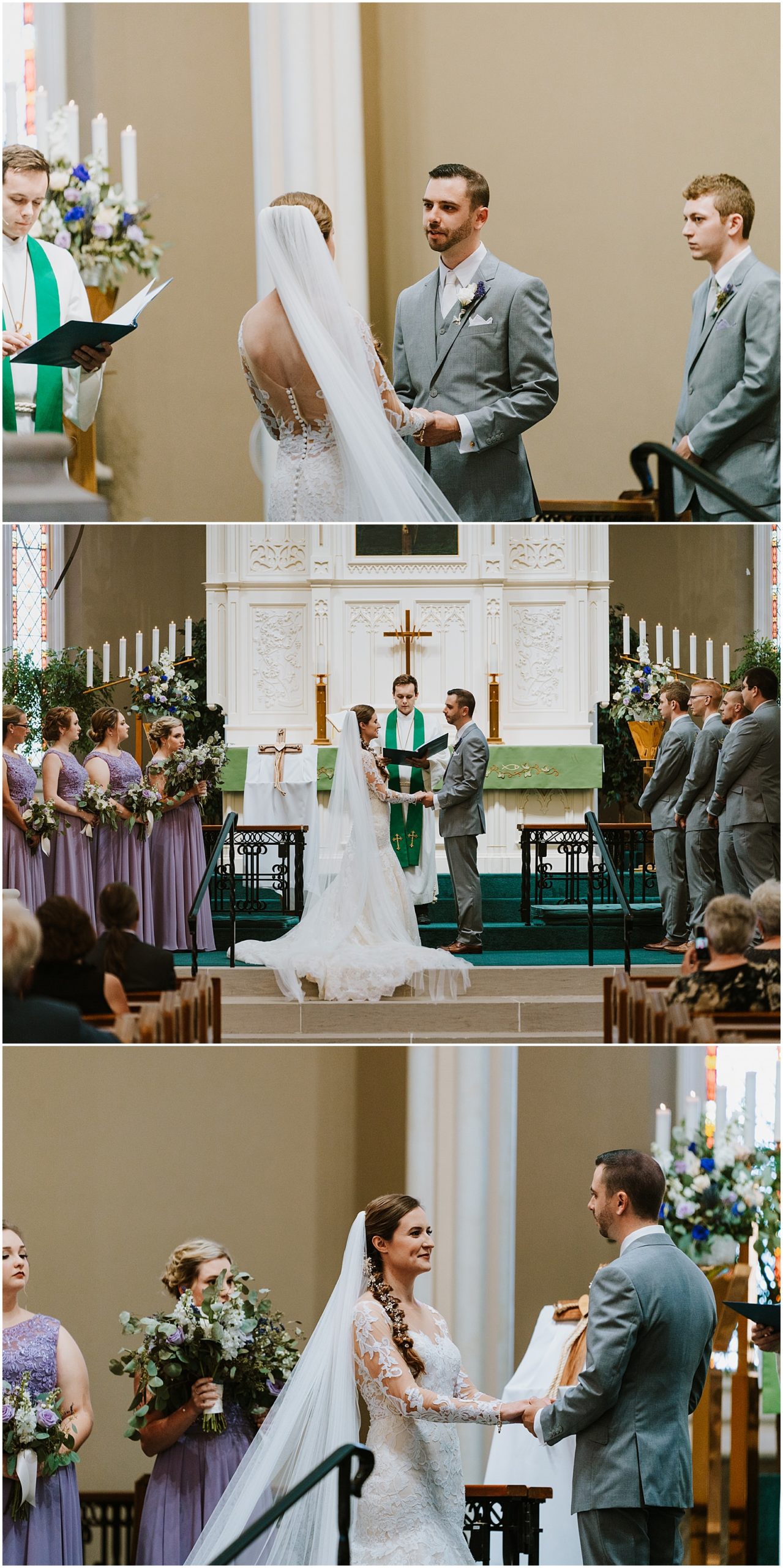 After separately getting ready at local airbnbs, Jamie and Trevor said their vows at the gorgeous St. Lorenz Lutheran Church in Frankenmuth, Michigan. The church was the perfect backdrop for Jamie’s stunning dress (that train, my goodness! so long and so beautiful!). We made sure to make use of some of the church’s architecture for photos.