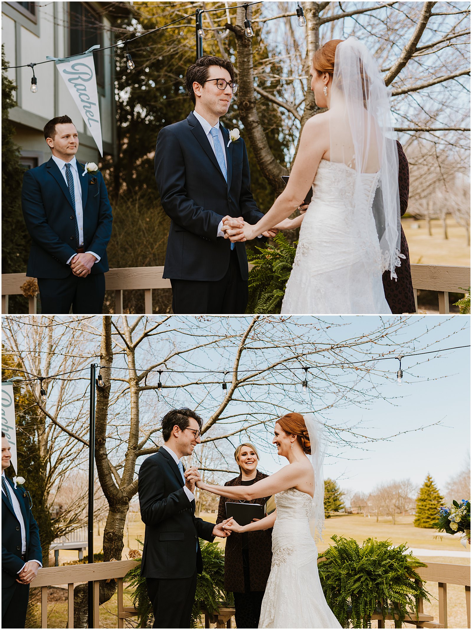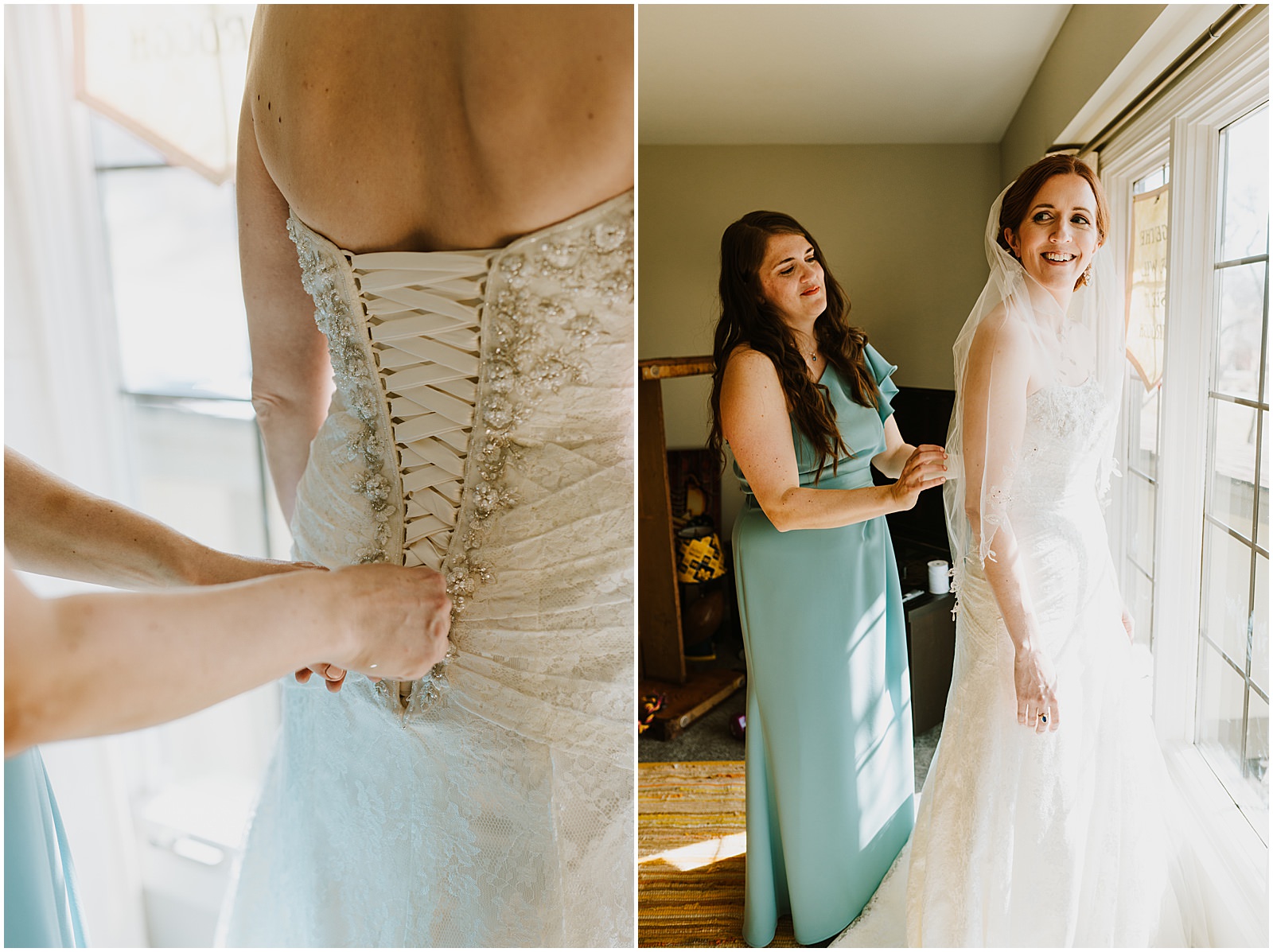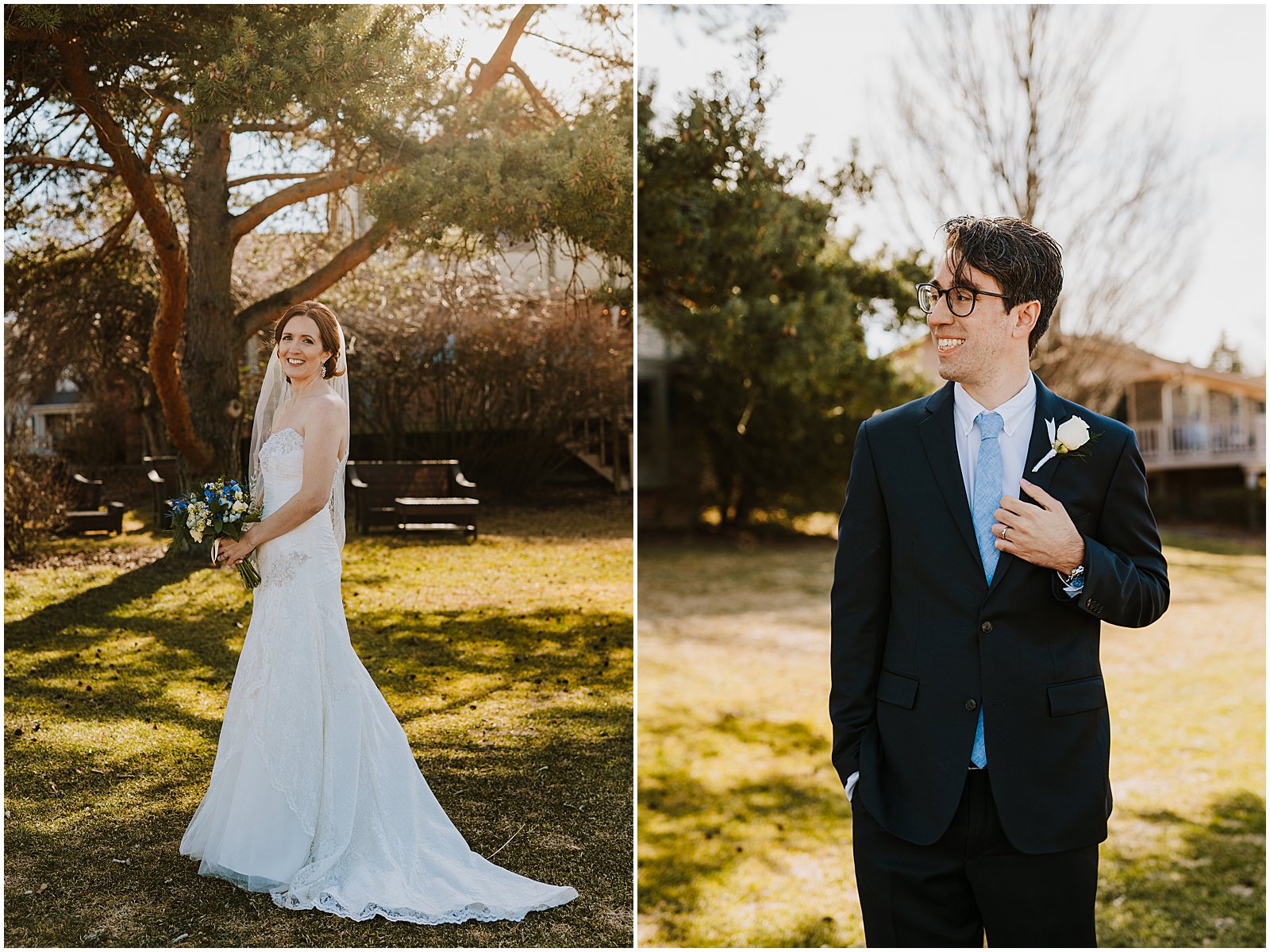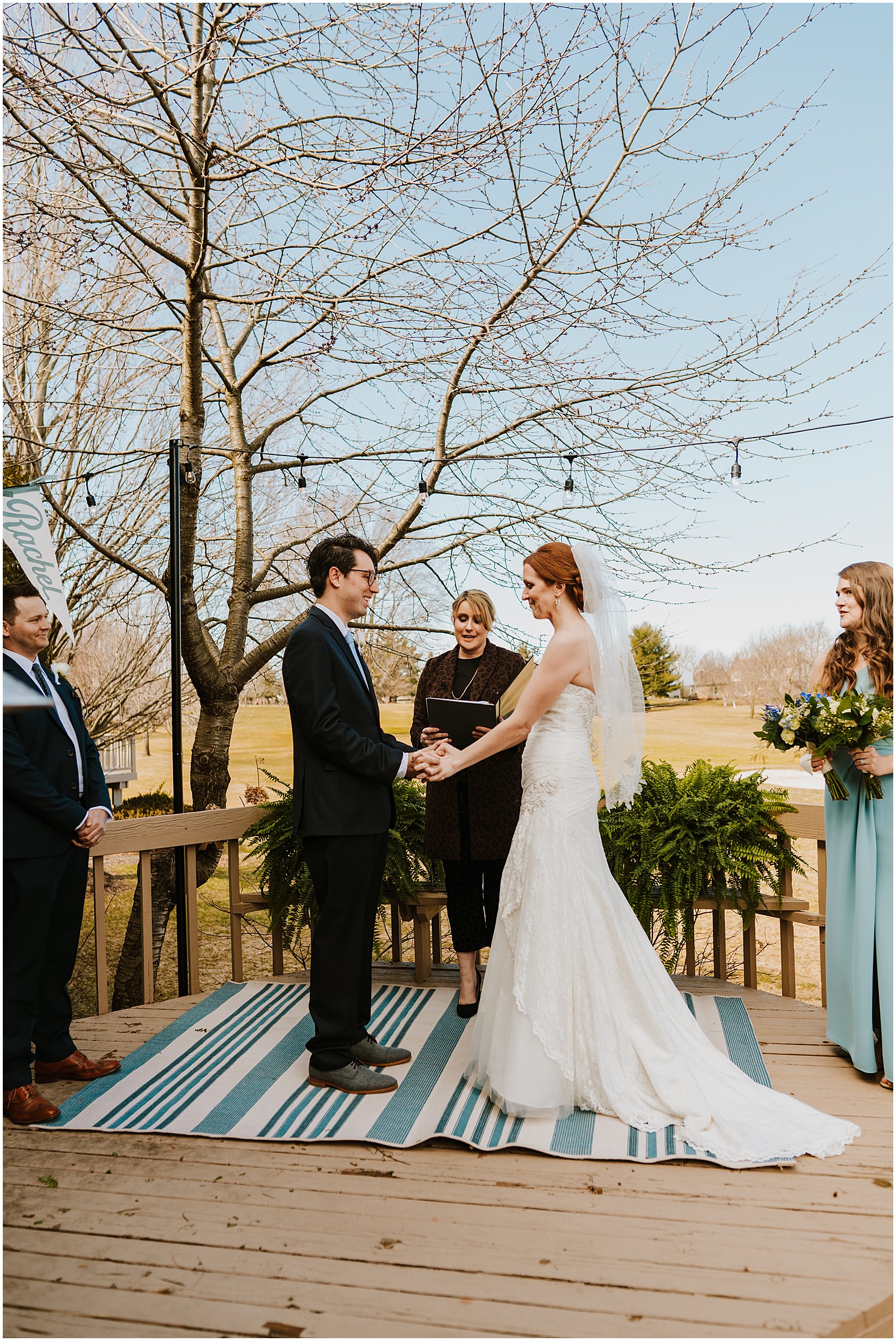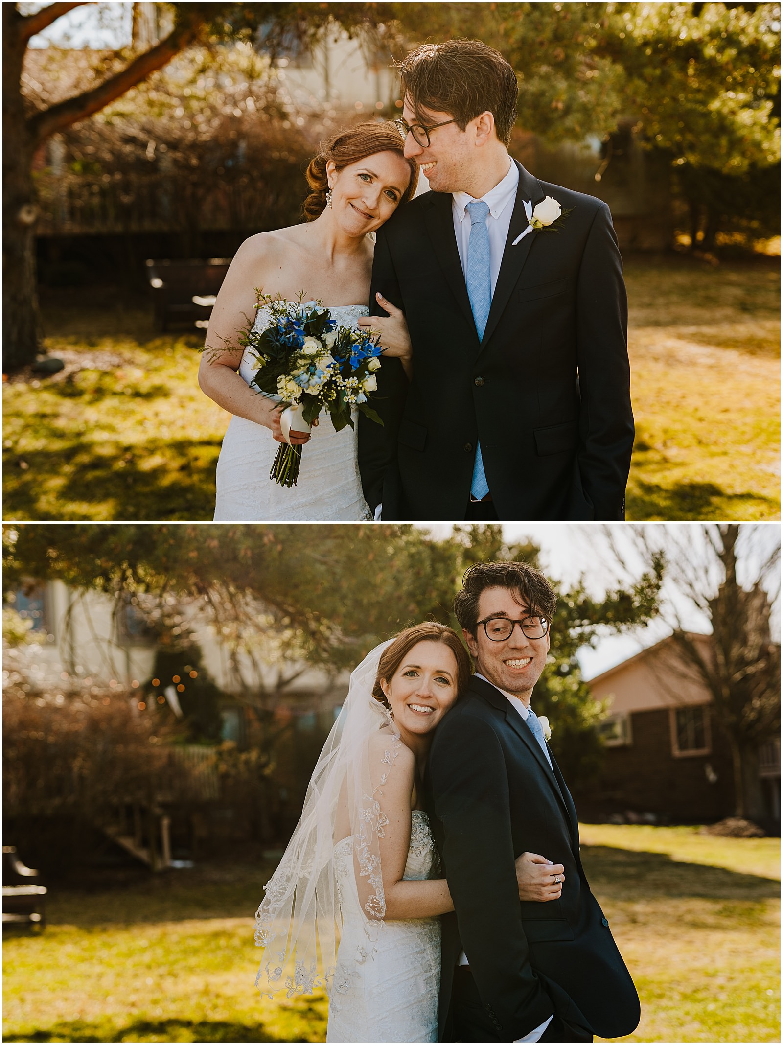 When I first spoke to Taylor and Rachel, it felt like I was talking to two friends. They are super down to earth people with pithy senses of humor and great style. They got ready in the house they purchased together and said their vows right on their back deck. They were incredibly lucky with the weather for a spring backyard wedding – sunny and warm for March!