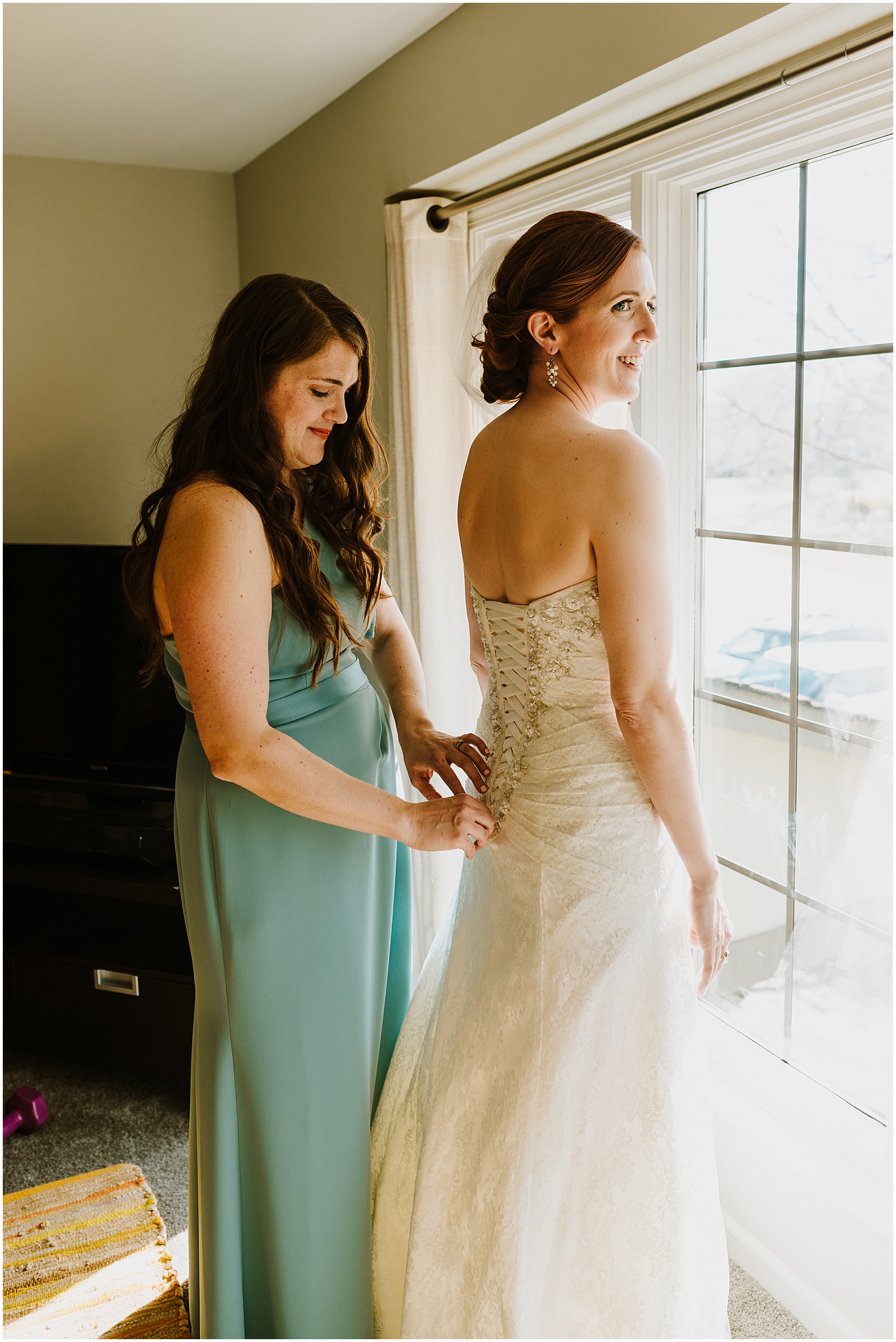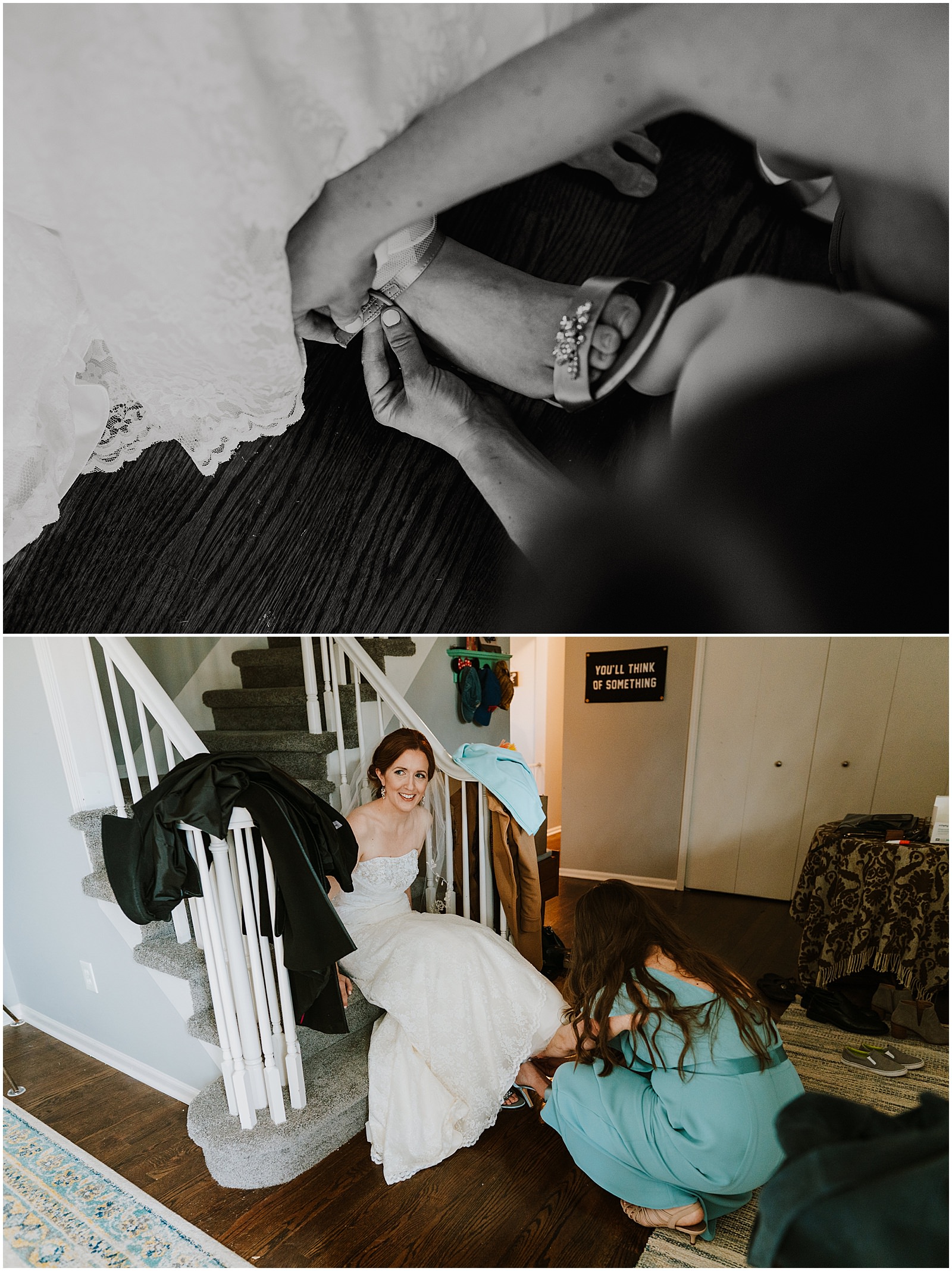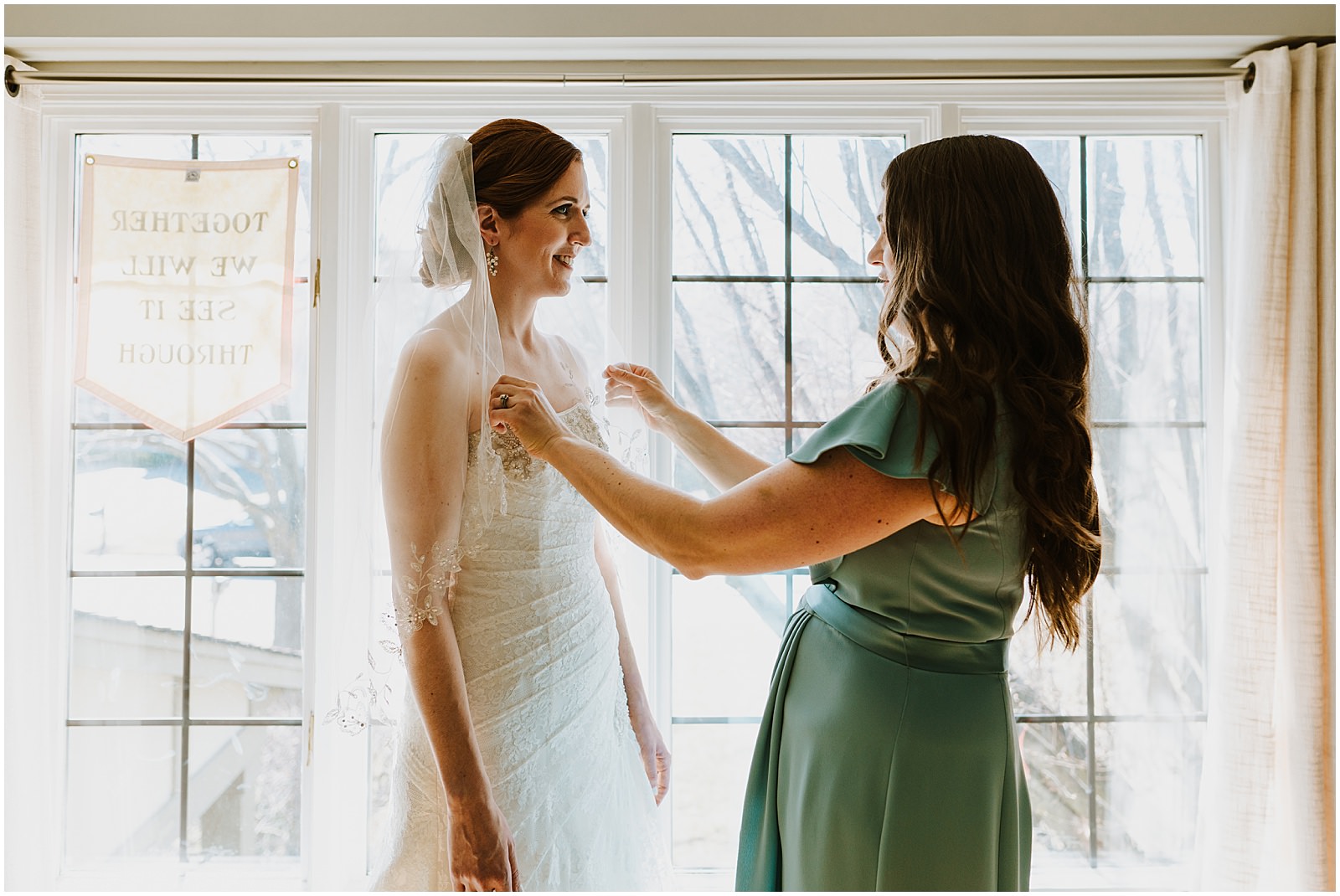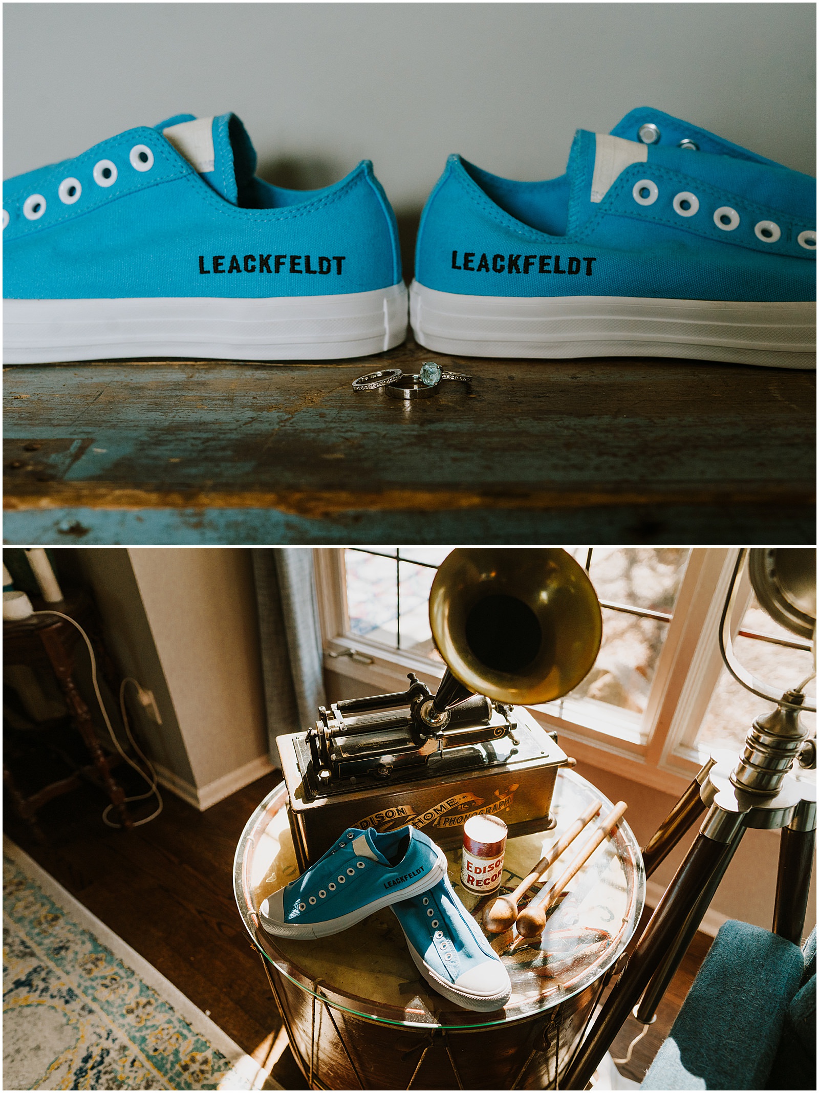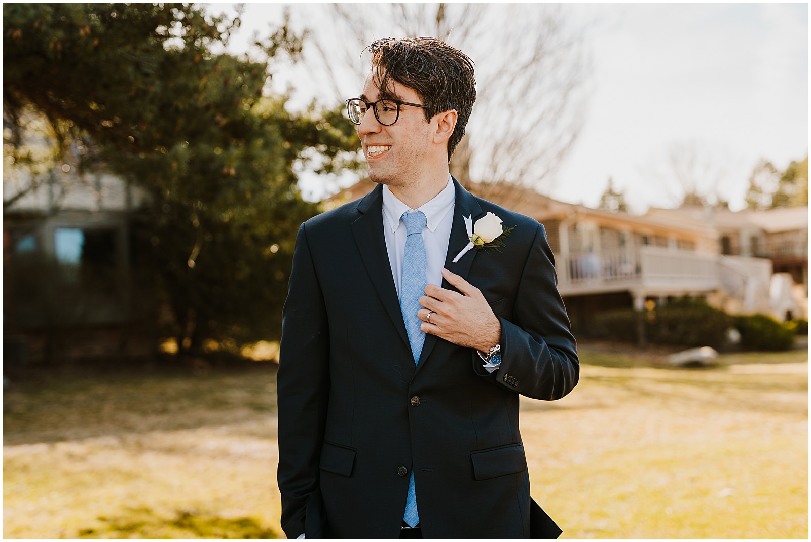 When I first spoke to Taylor and Rachel, it felt like I was talking to two friends. They are super down to earth people with pithy senses of humor and great style. They got ready in the house they purchased together and said their vows right on their back deck. They were incredibly lucky with the weather for a spring backyard wedding – sunny and warm for March!