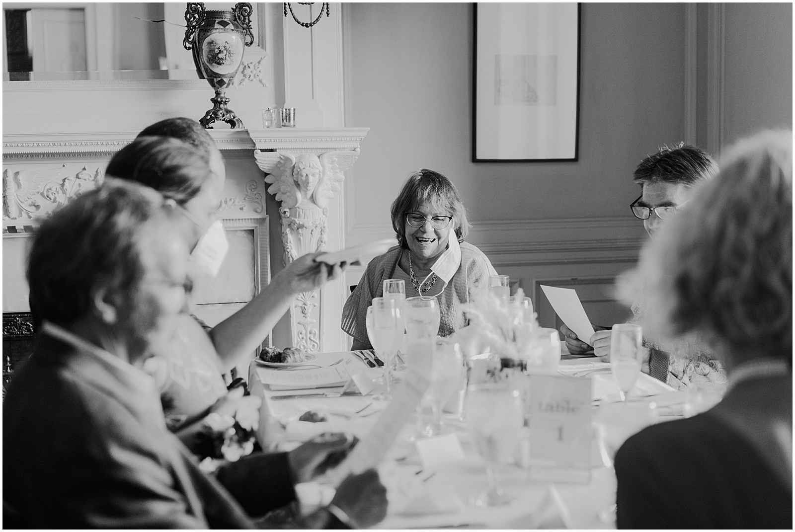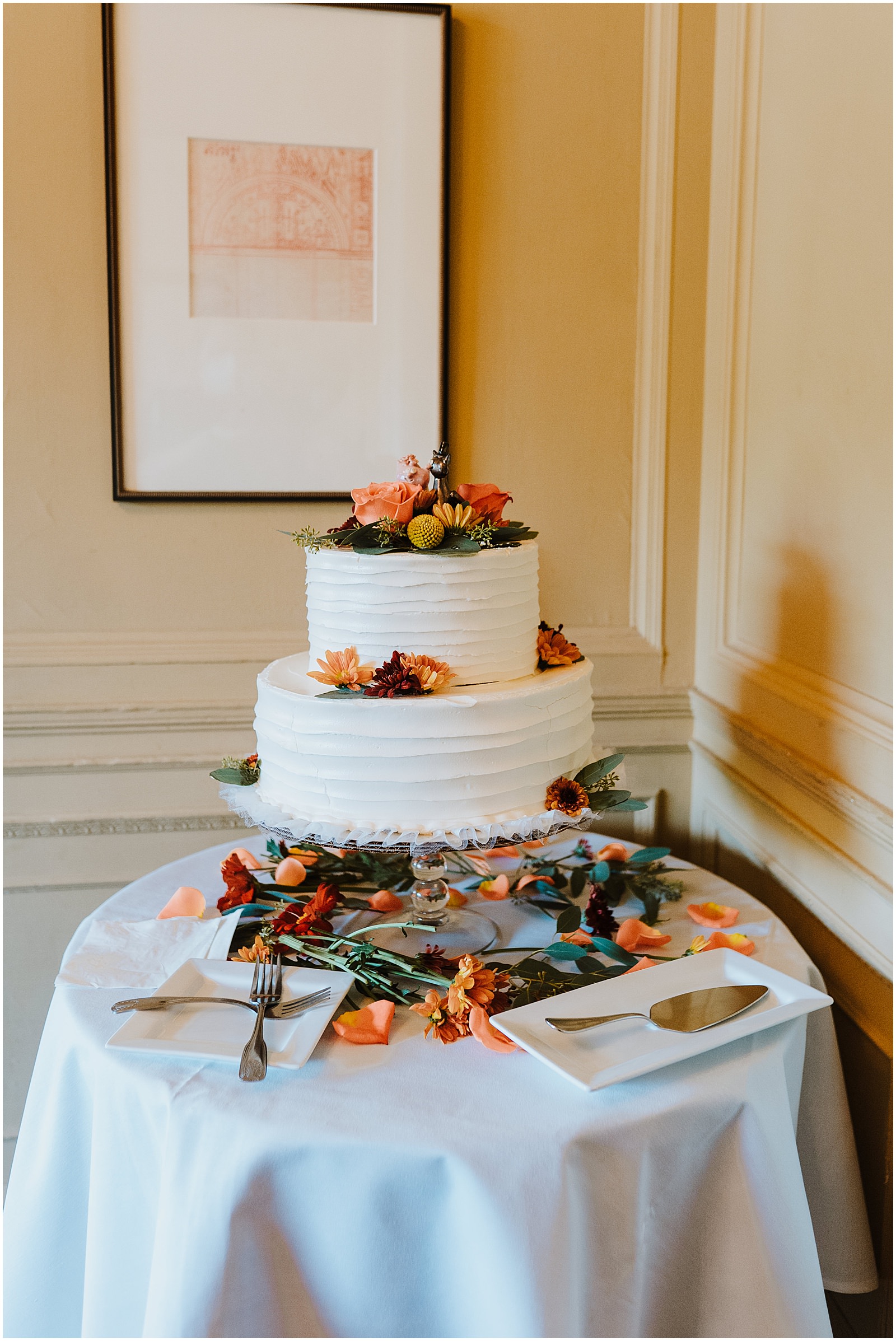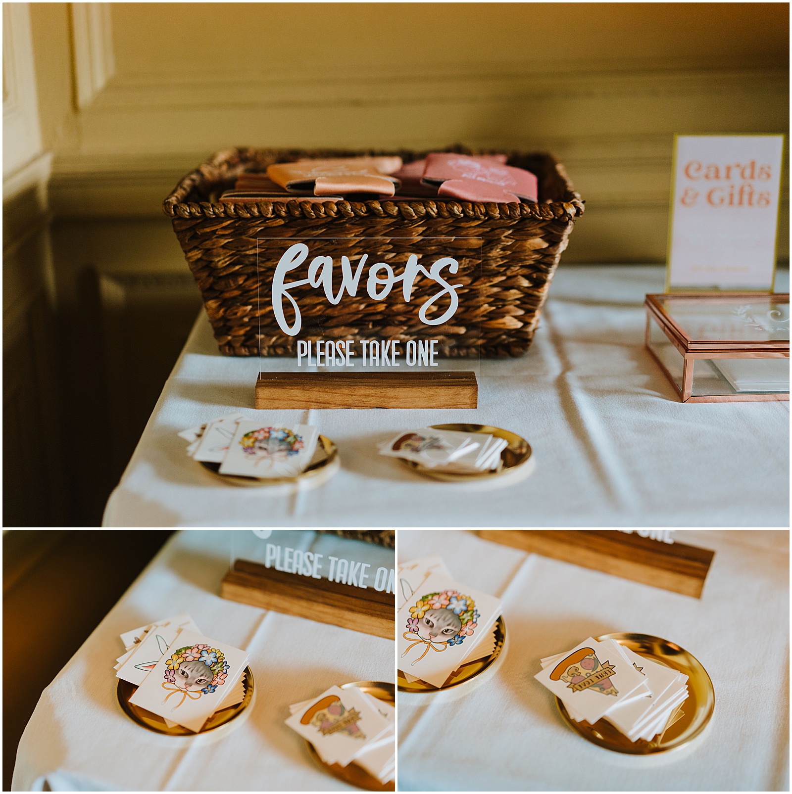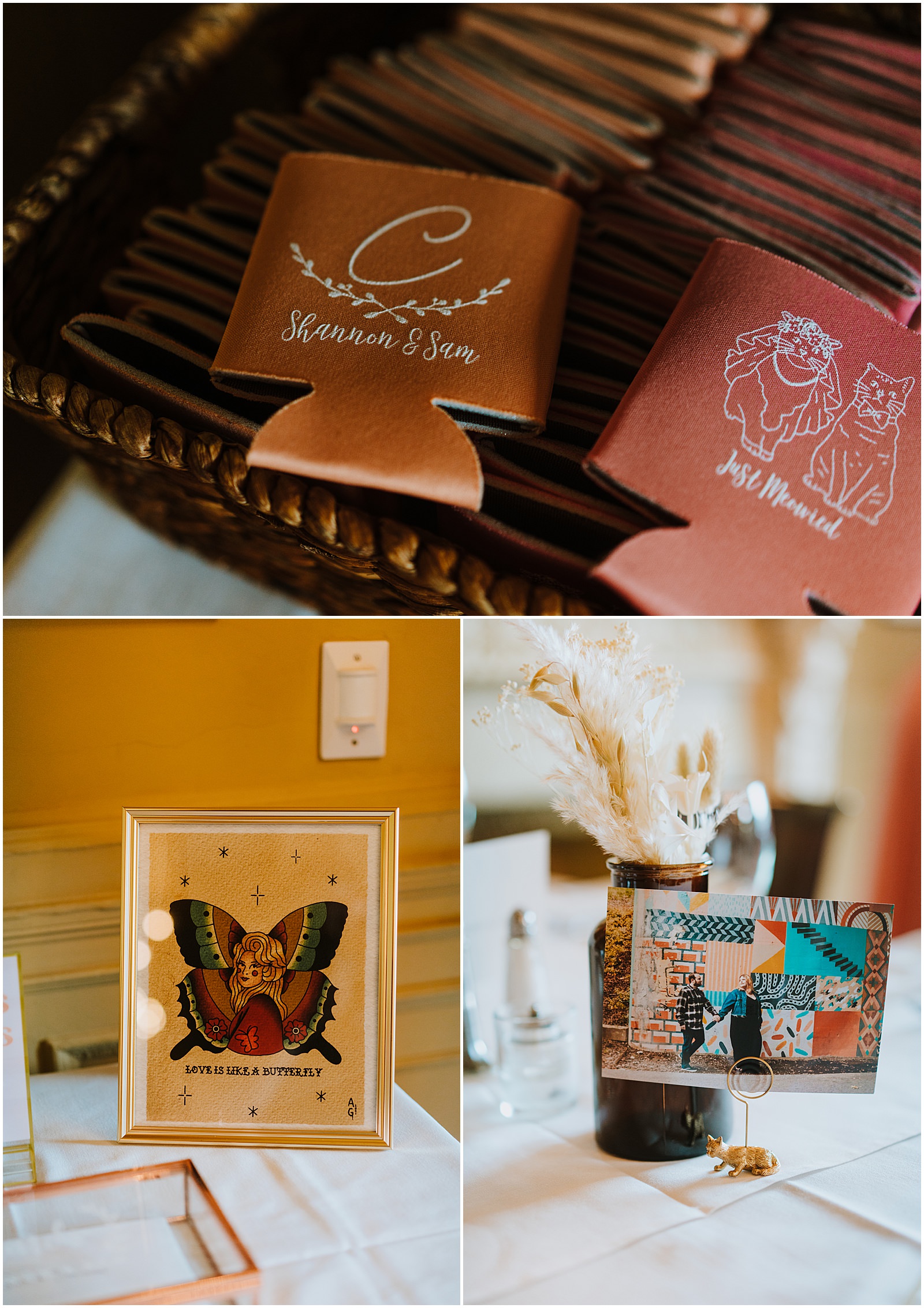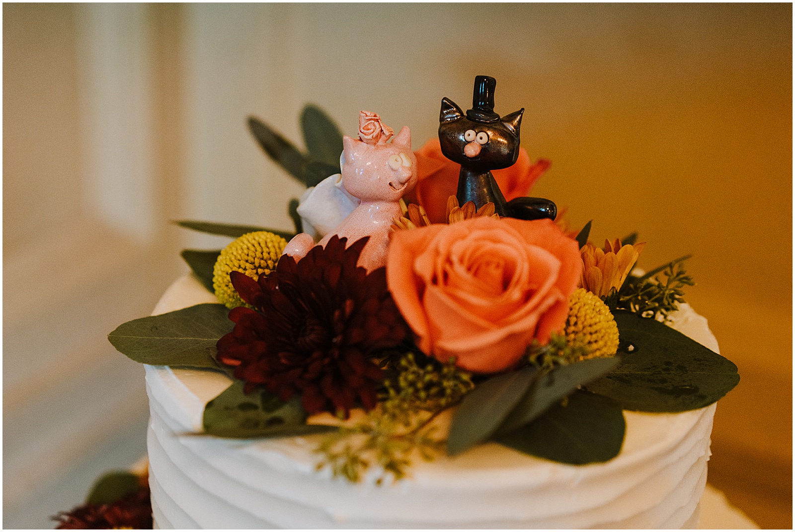 After a cocktail hour outdoors, everyone filed inside to enjoy a brunch, complete with cake. I loved the adorable details, including the couple’s cats as part of the wedding favors and decor.